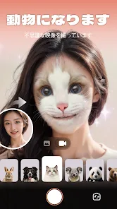 🦁多様な動物フィルター: 猫や犬だけでなく、ライオンやパンダなど多くの動物フィルターが揃っています。