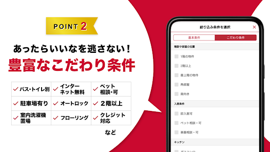 🔑 細かな検索条件: 幅広い検索条件を設定することができ、希望にぴったりの物件を見つけられます。